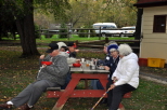 For our Hobo Stew Robbi Haines is working in the kitchen on the items that will go first into the cauldron outside over the open fire. Jonathan Shaffer, Ron Trenhaile, Paul Emch, Dick Clark and Joe Laskowski try to keep warm around the fire ring. |