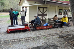 Ted readies his American steam engine up on the steaming bay with Jonathan and Josh Frank assisting. Dick talks to Paul Emch before the start of his next run. |