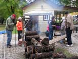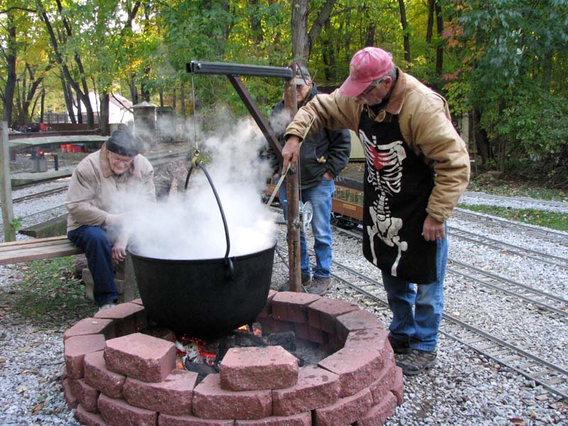 Tom Reder along with Edith Hacker watch as Roger Harnish pokes the logs in the fire pit for better combustion. We used to have a tripod affair made with pipe to support our cauldron and now thanks to Roger, Mike and Marcel we have this. |