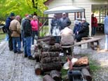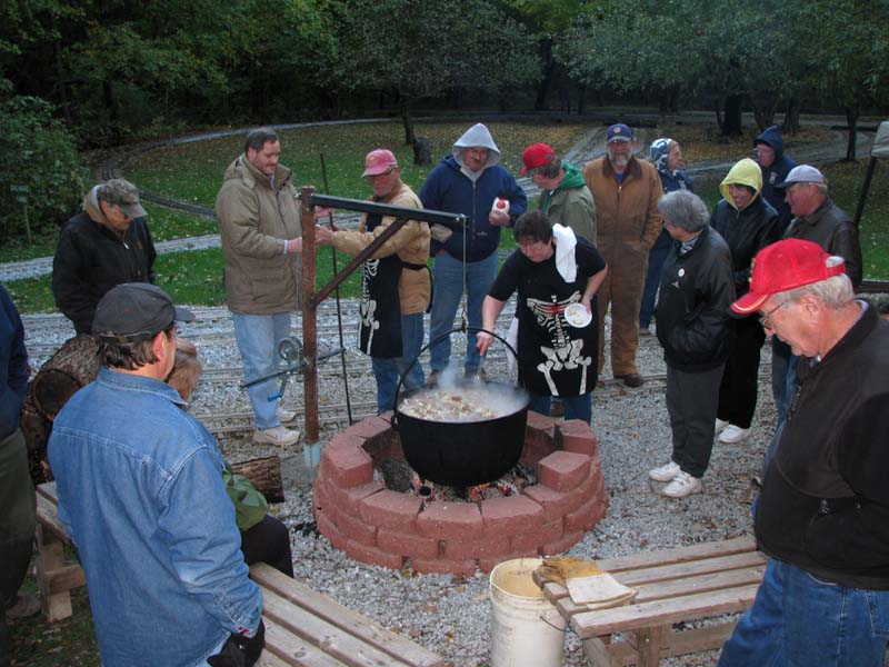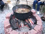 The cauldron with the makings of hobo stew bubbling and soon the cabbage will be added. Anticipation as the members and guests keep warm around the fire and wait for serving time. |