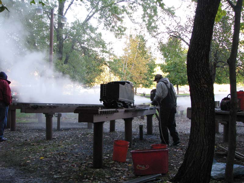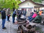 More members and guests are showing up for our Hobo Stew cook out today. Ken talks with Frank Foti on his steamer before his next run as Dick Clark at the right passes them in front of the station. |