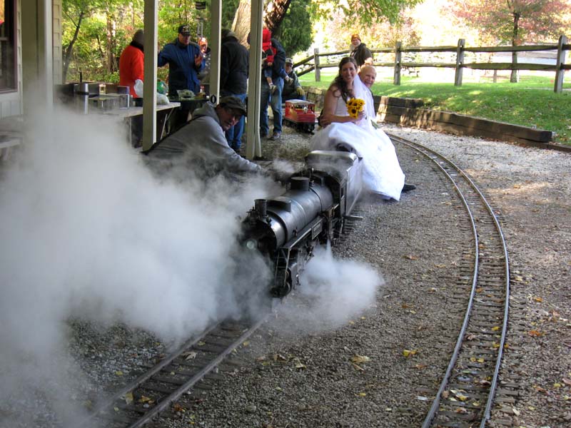 While I was out riding a train Joe Laskowski took these two photos of the bride and groom that came to the Park for photos and used East Wind for a couple of their remembrance pictures. That's Frank making with the steam. |