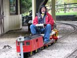 Richard Sales coming into the station with his electric powered cab that he makes followed by Ken Brooks. Richard letting one of the guests take his train out for a run as he monitors the action. |
