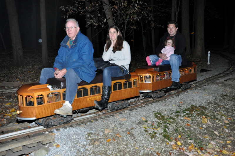 Granddaughter Nora Howell in her giraffe costume poses with grandma and grandpa, Margaret and Dr. Mike Uhrich as they take time out from pumpkin carving for a picture. Bob Pakeltis with his grandson Adam Pakeltis arrive back at the station with the Toby train before the start of the Whooloween Run. |