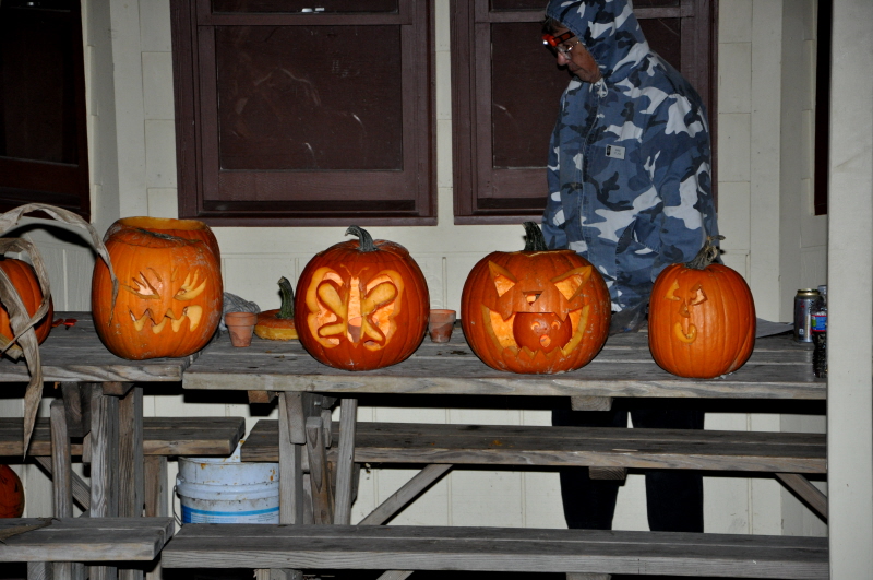 Mike with the Camelback having just stopped at the unloading area talks with Anna Zorko as Edith watches. Marie Nyland with a light strapped to her head works on creating her special pumpkin that she diligently carves on. |