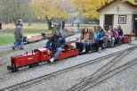 Paul Zorko with his SW6 switcher, which is a Morris unit, leaves the station on this overcast day with his daughter Jennifer Legan as his conductor. Rick departing the station with another full load of passengers on his second run and the public line of passengers waiting to ride the train is growing. |