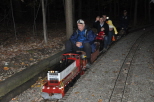 Rick emerges from the Truss Bridge with his passengers and will soon be taking the grade up to Mackey's Run. Sean coasting down the grade from Hilton and you can see the rain droplets caught in the flash of the camera as it's starting to rain harder. |