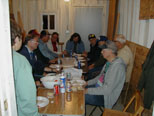 Edith Hacker, Frank Foti, Frank Russell, Roger Harnish trenching for yard drainage under the watchful eye of Rex Shriver. Members eating the first supper in the new addition. |