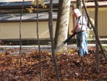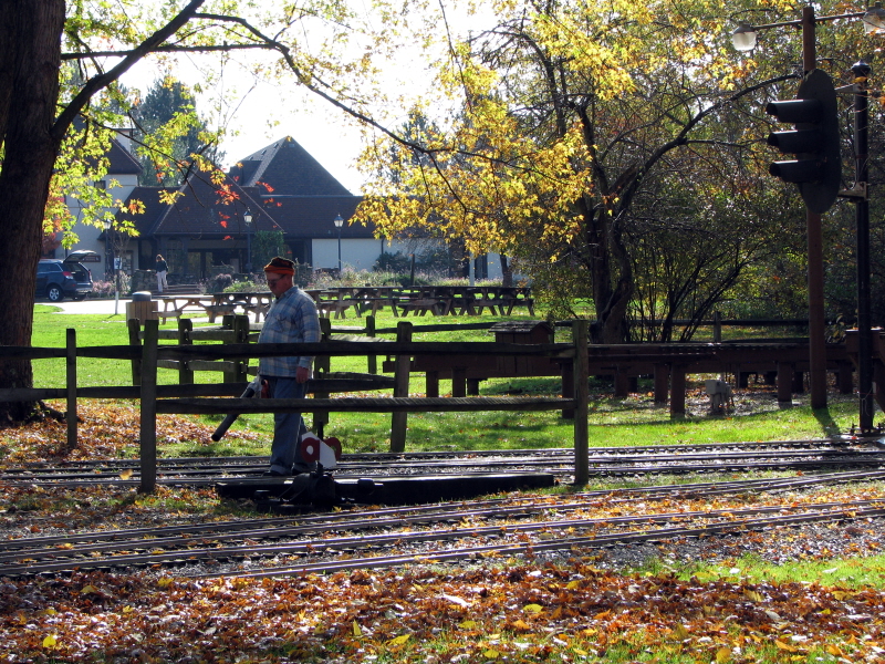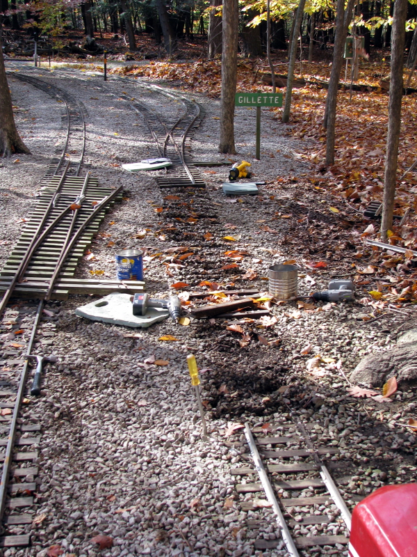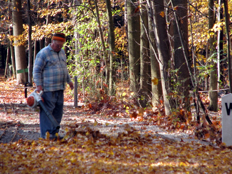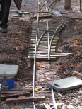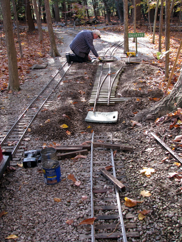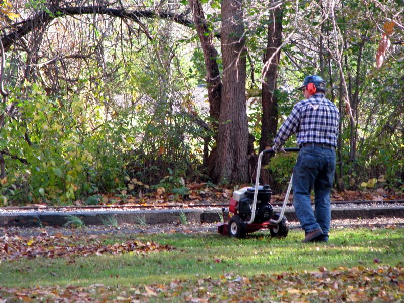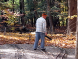 We unbolted the rail joiners at the end of the track panels for the length required by the switch and picked the track panels out of the ballast. John Koontz working on leaf removal with his backpack blower by the Willis Car Barn as you can tell by now it takes a serious effort to remove the leaves in the fall. |