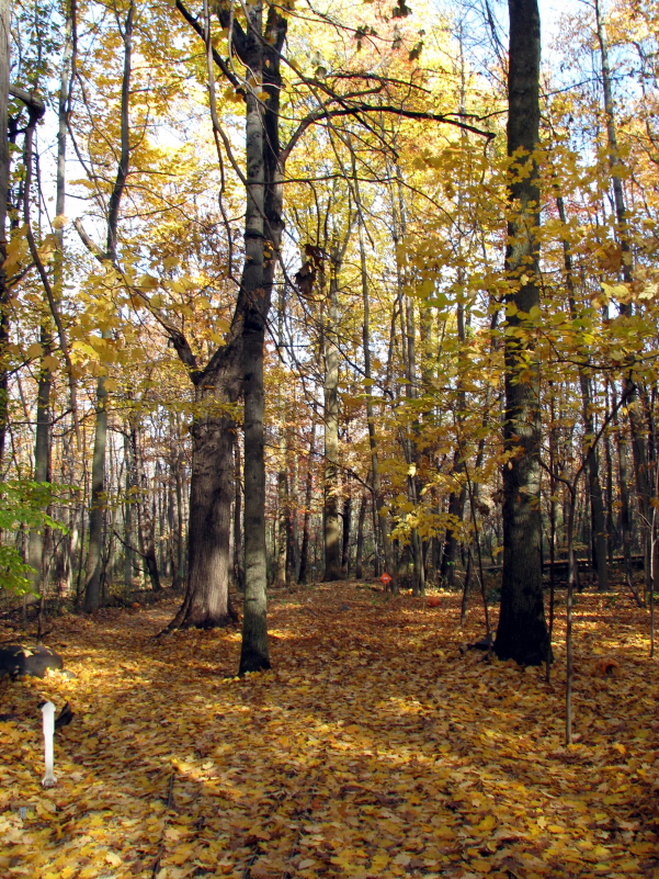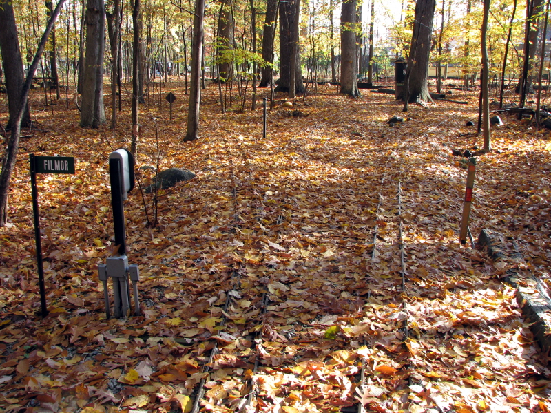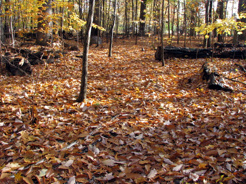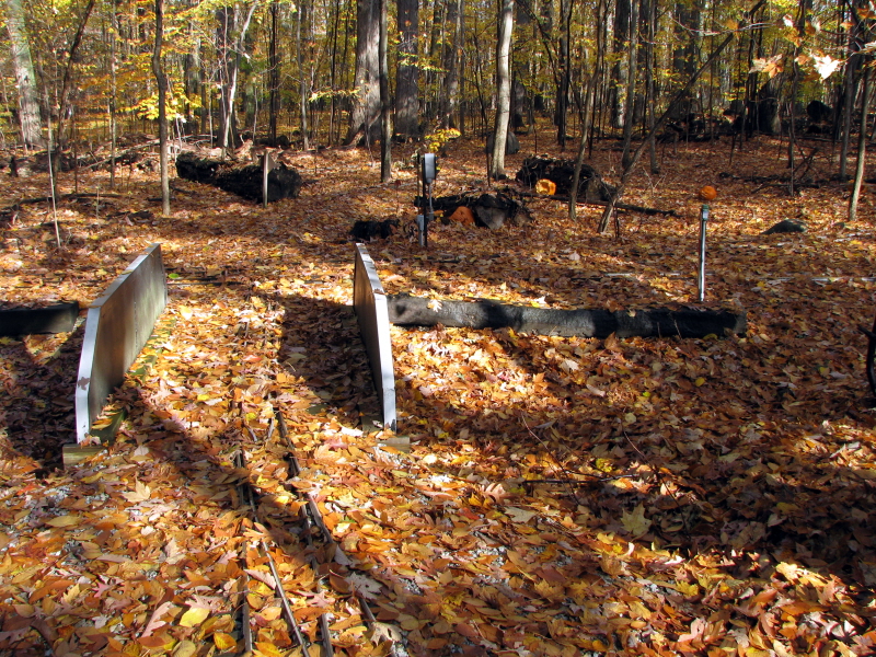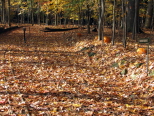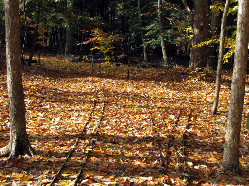 View looking through the Truss Bridge at the grade up to Mackey's Run covered in the fallen foliage. From Mackey's Run looking towards Big Bend bridge there's a track to the left of the trees and two parallel tracks that go towards those trees and they are hidden by leaves. |