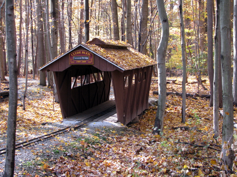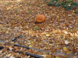 The pumpkin that was carved for the LSLS railroad for Whooloween night will soon be food for the critters of the woods. The right away and track up by the covered bridge has already been worked on by blowing the leaves to the side. We still have a run yet in December for the public but we would still want to keep the wet leaves off of the track to keep the ties from rotting. |