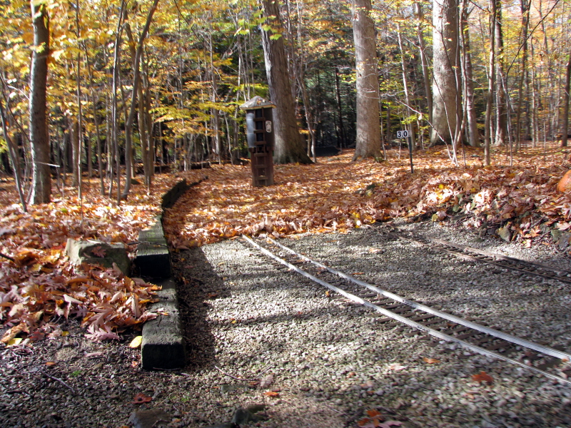 Rick Nagy by the water tower in front of the steaming bays works with the leaf blower trying to clear the tracks because we still have a run in December. This is a view looking down Horrendous that's buried in leaves and you can see the pumpkins where they are abandoned for the animals to eat. |
