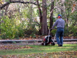 Wayne Boron wears ear protection as he uses his blower to clear the Orchard Yard of the leaves that have fallen back there behind the station. Rick cleared the leaves from the track from the access road across the front of the steaming bays as he works towards the station. |