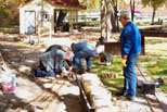 George and Dick taking a break as Lou and his grandson, Andrew watch. Mark Ross(background) was working on switchpoints today. George and Tom continue with fastening the rail down to the new ties. |