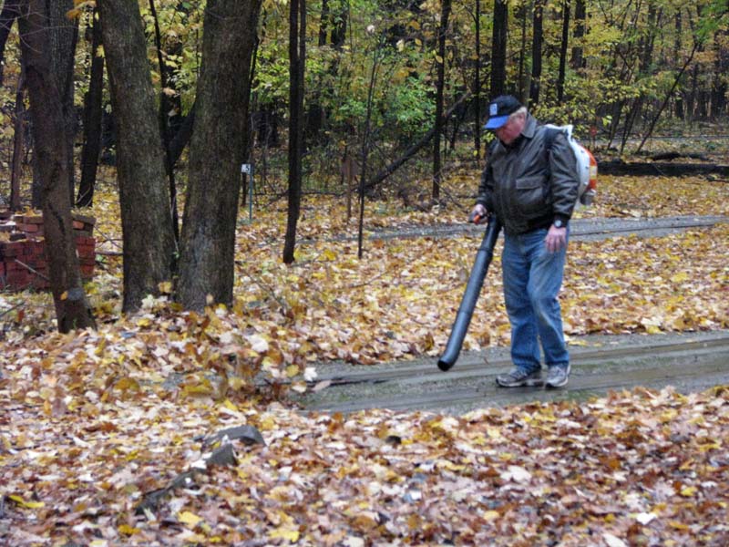 Some of the leaves have been blown off of the yard tracks and I can hear the blower operating in the woods. The Park has contracted to make changes to the parking area and this is some of the equipment. |