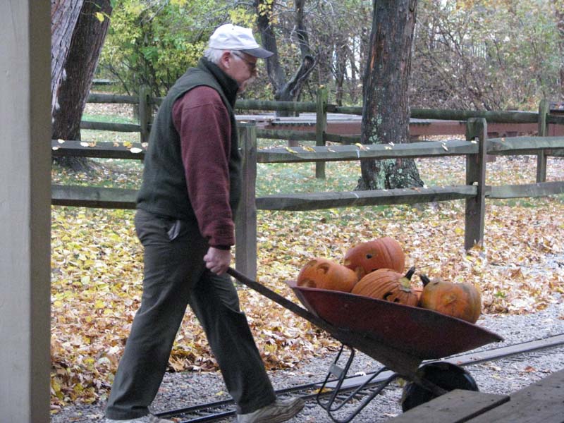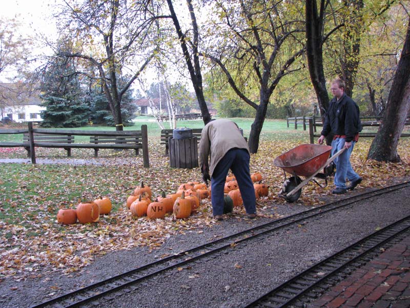 John has worked his way up to the station with the leaf removal from the tracks. George Woodling and Mike Harkleroad work at the task of moving the rest of the left over pumpkins from the Whooloween Run into the woods for the animals to eat. |