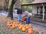 George loading some more pumpkins into Mike's wheelborrow. Ken Brooks taking another load of pumpkins for a ride which the forest creatures will surely enjoy for the next few weeks. |