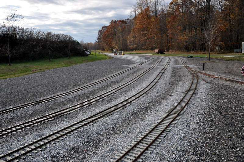 After taking the southern loop Frank takes the curve that will go into the cut shored up with railroad ties to keep the earth back as we head back towards the station area. This view showing how deep the cut can be. |