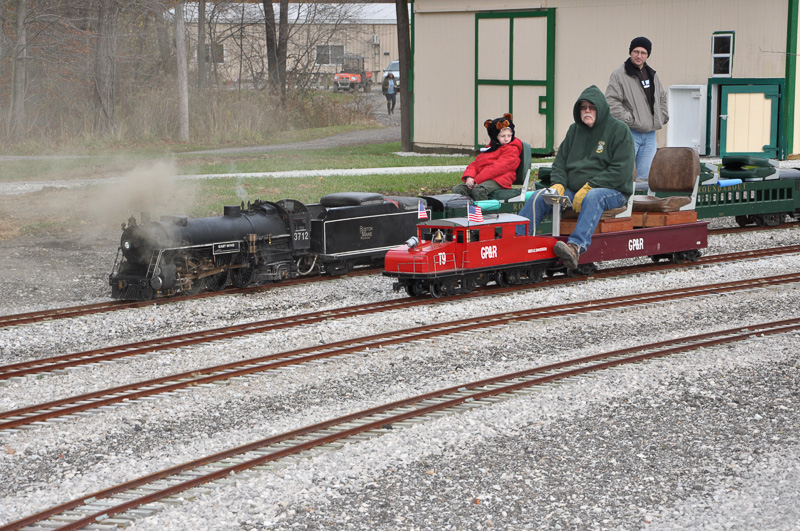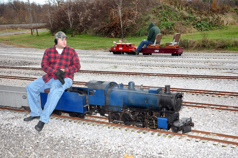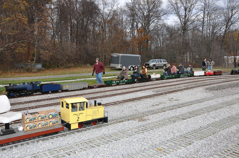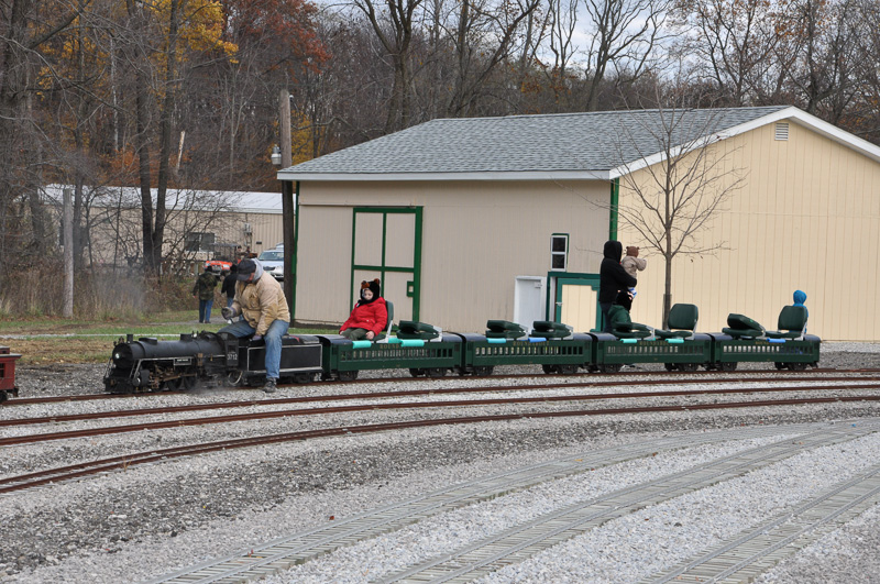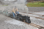 With the blowing of his whistle Mitch opens the throttle on the Consolidation as he starts his next run. Ken Brooks runs by as East Wind simmers on the adjacent track and it's definitely getting cooler out here. |