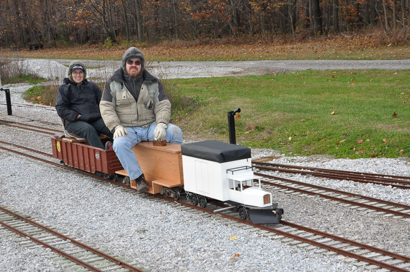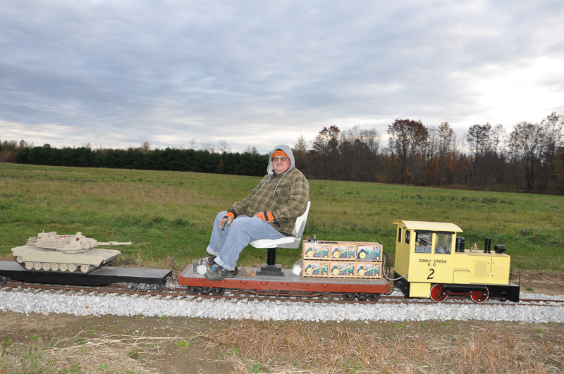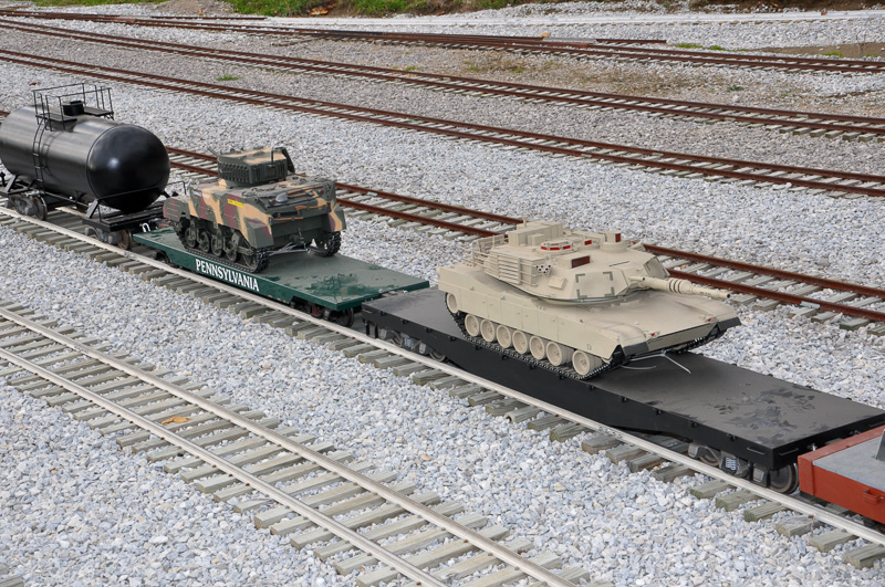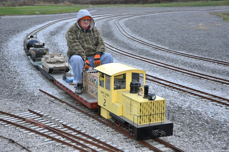 Donna and Bob Craig all smiles and they are all bundled up against the cool weather today as they travel eastbound on the mainline. Two of the flat cars on Rick Nagy's train have military tanks for the load. |
