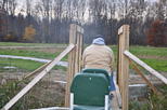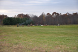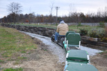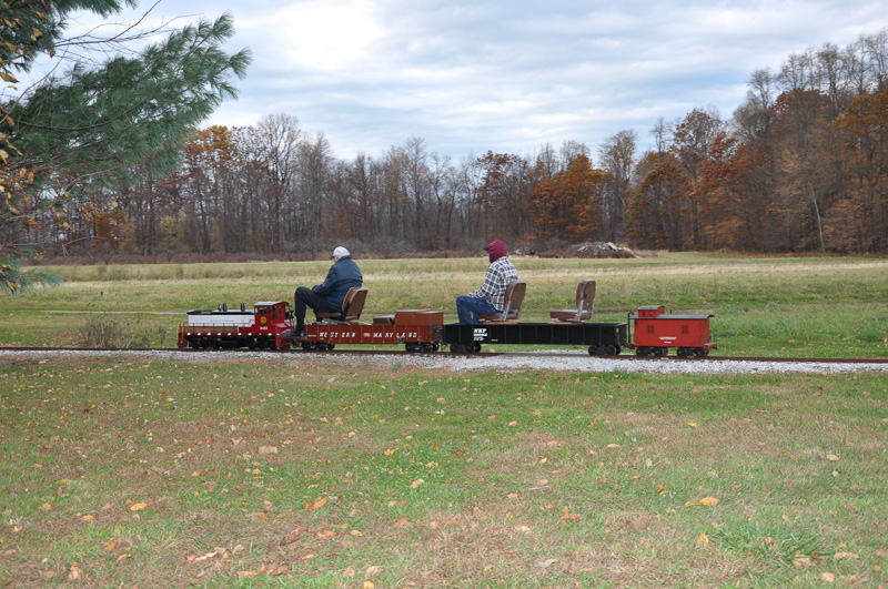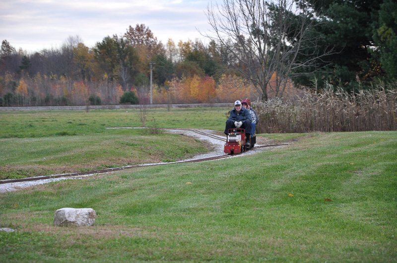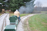 The loop at the farthest West end of the trackage has 3 trains that are getting bunched up off in the distance. As we emerge from the cut that runs parallel to the real railroad tracks at the edge of the property Frank comes into view with his passengers. |