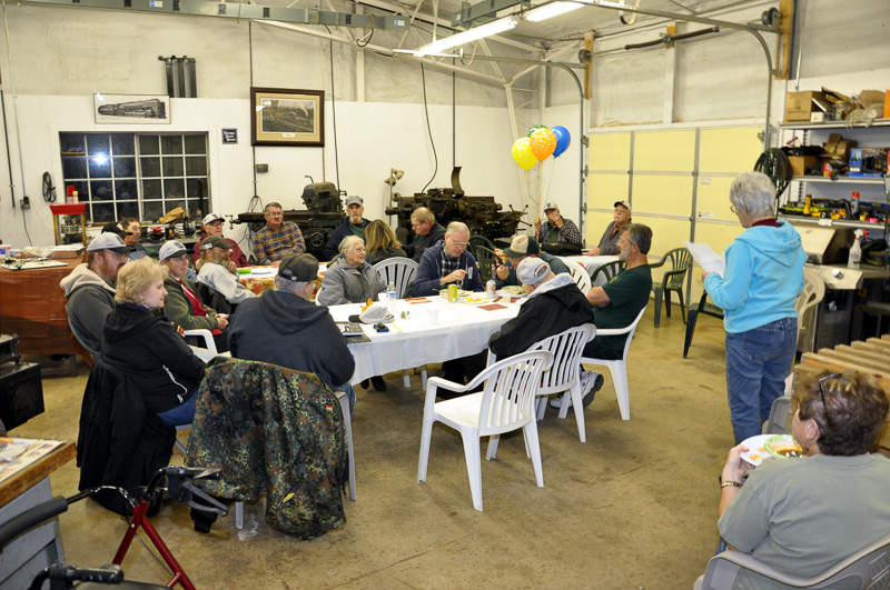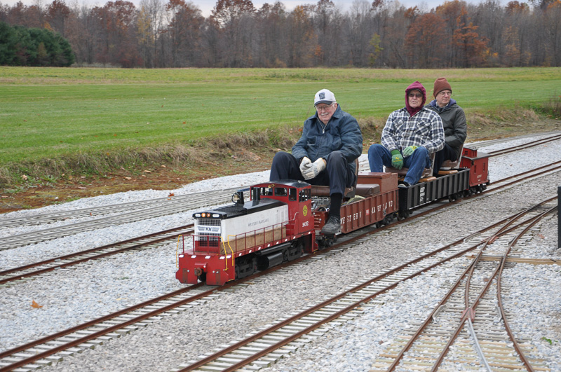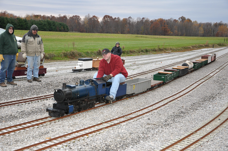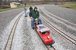 Ken with Bob and Donna behind him, wait at the station area for the track to clear ahead. As Mitch shows someone the controls on the Consolidation, Dick and Frank pass by on the mainline. |