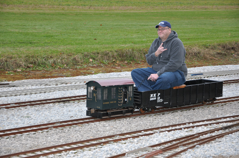 Mike Harkleroad passes by the photographer running the Consolidation steam engine and also running light, but at least he is smiling. Brett Lane came by shortly running the electric powered box cab that belongs to Mike Uhrich. |