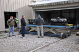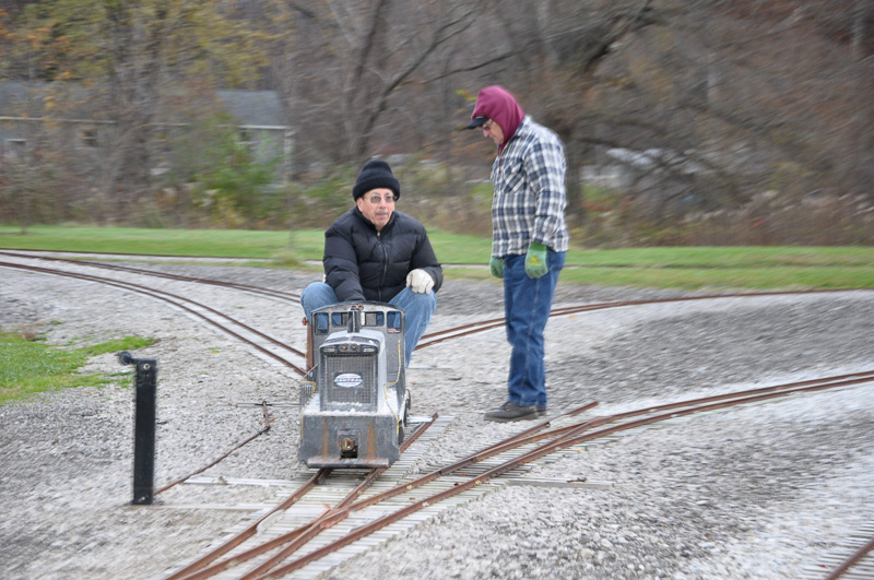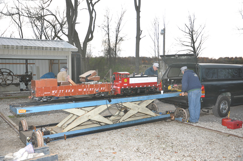 Rick arriving back towards the station area where the track in the foreground left side heads to the transfer table. Back at the machine shop, Dick gets a hand with the transfer table loading his engine and riding car into his pickup from Jeff Stanek. |