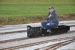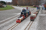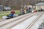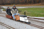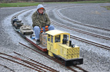 With Rick's engine and train in the foreground, Mitch Lane heads back up to the steam engine after checking the riders. Frank has pulled up behind Mitch with his train and checks over his engine gauges as he waits for the track to clear ahead of him. |