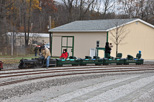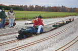 Rick Nagy and Ron Malinowski watch as Karl Losely runs the transfer table with the hopper and tank car on the table. Frank Foti arriving back near where the station will be with East Wind. |