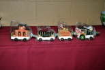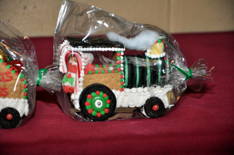 John looks at the tire inflator, emergency light kit that Trish won. One of the gifts turned out to be a gingerbread train with cookies that made up the boiler and the load in the gondola made by Marie Nyland. |