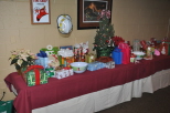 A view across two tables of the gifts for the "Chinese raffle" that the members provided that were marked for "him", "her" or "either". The group enjoys the conversation as we wait for the servers to start calling the tables up one by one. |