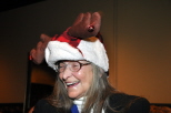 Mark Ross brought in some festive hats for the holiday season and here Edith Hacker models one with the reindeer antlers on top. Phyllis Speidel along with Edith who was now wearing one of Mark's hats that has chasing LED lights on it squeezed together with Belinda Brooks for the photographer. |