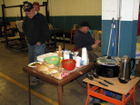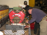 Steve and Rick look over at the wiring that his been redone up to this point as Joe in the background eats his lunch. Wayne Boron and Joe Banzer have been doing most of the rewiring on this engine and made up a diagram for the rewiring of the engine. |