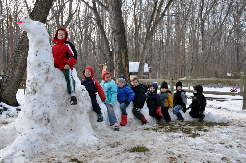 Frank on East Wind as he approaches the switch coming into the station. Marie Nyland kneeling as she packs the snow to build a snow dragon as the children watch. |