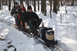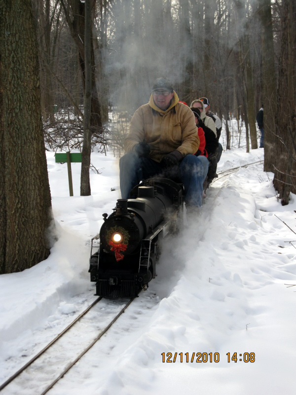 Kitty joins in with Marie in helping to form the dragon out of snow. Ted Nyland as conductor on Ken's train as it leaves the station with Rick Nagy taking over engineer duties on the GP38. |