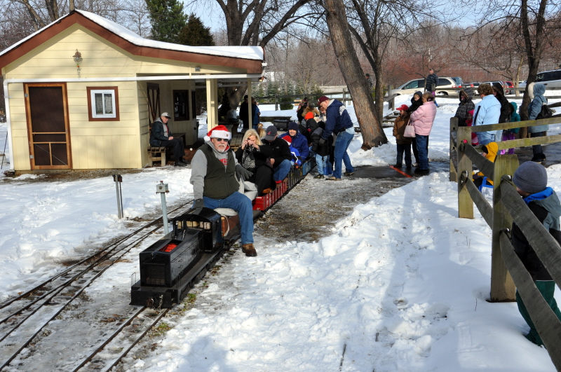 Ken departing the station with his load of passengers as Mike pulls up to the loading area with the GP38. Mike all loaded and with the short waiting line due to the weather, many people had a chance for a second ride. |