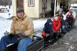 Mike leaving the station with his passengers and Dave Foster as conductor. Kitty Shriver dressed up as an elf helping at the unloading area and passing out candy to the children. |