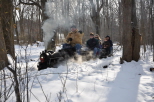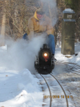 Frank Foti coming into the station with East Wind amongst a cloud of steam with his passengers. Mike behind the station at Sharp on his first of two loops around the station because of the shortened run due to the snow. |