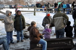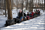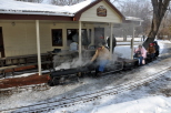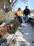 The Lake Shore Live Steamers gathered at the station waiting for the beginning of the run after having cleared the snow off the track. Mike Harkleroad with the GP38 about to begin his run after being loaded by John Blotnick. |