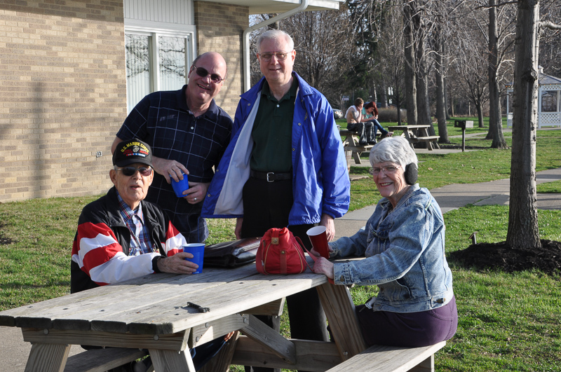 Sitting at this table is Bill Besselman, Ken Vendlinger, Ron Trenhaile and Kitty Shriver enjoying the warm rays of the sun. Bill looking out over the lake appears to be deep in thought caught in this peaceful pose. |