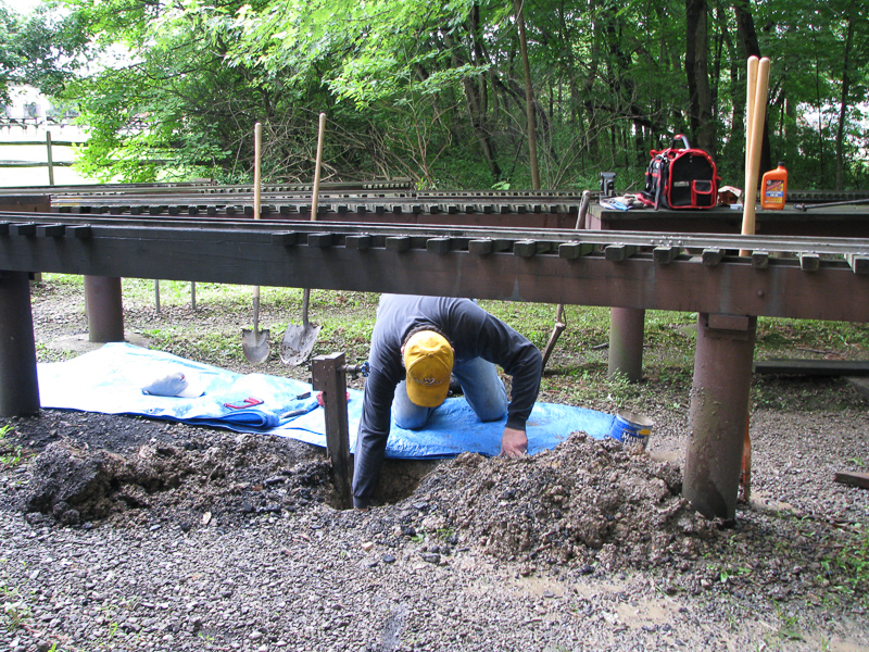 Greg Guy come out a couple days after our last work session and set up the signal bridge at the beginning of Horrendous westbound. You can see the railroad ties that he used for the foundation of the signal bridge. |