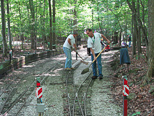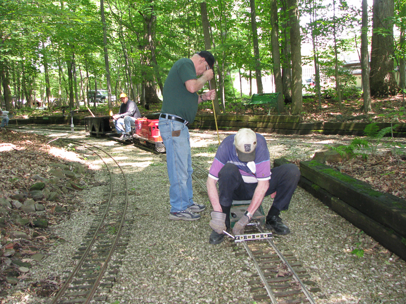 Dick Clark levels the track with Bob Pakeltis behind him tamping the ballast as Frank Foti in the background with the work train waits to come up with the ballast car. Dick using the level and a large screwdriver to lift the track and level it. |