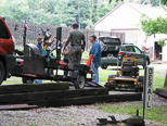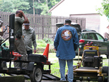 We had an extremely heavy rain last night and everything was just mud and here Wayne Boron is laying on the tarp and fitting up some pipe to come up above grade as Frank Foti watches. Perry had brought his mower but I think the grass is going to be too wet behind the station. |