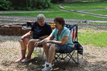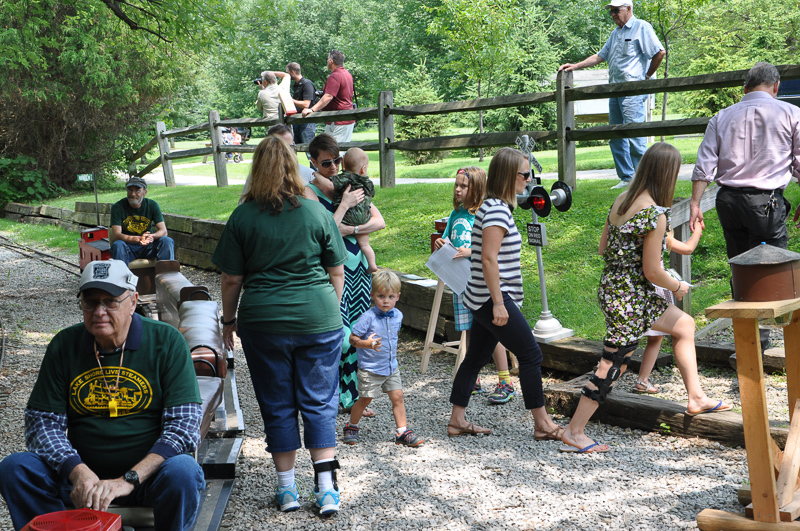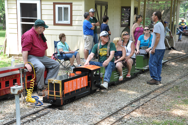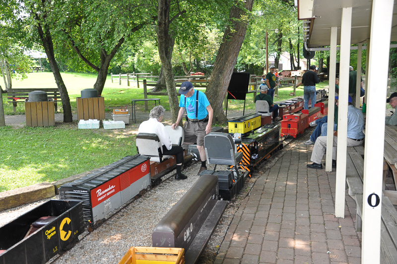 Andy Yedlick sits on top of the passenger car in the siding as Mike Harkleroad departs the station with his passengers that Greg Guy has just loaded. Anna Zorko sitting in the chair is taking passenger count as Greg gives riding instructions to passengers on Frank Smoley's train. |