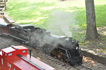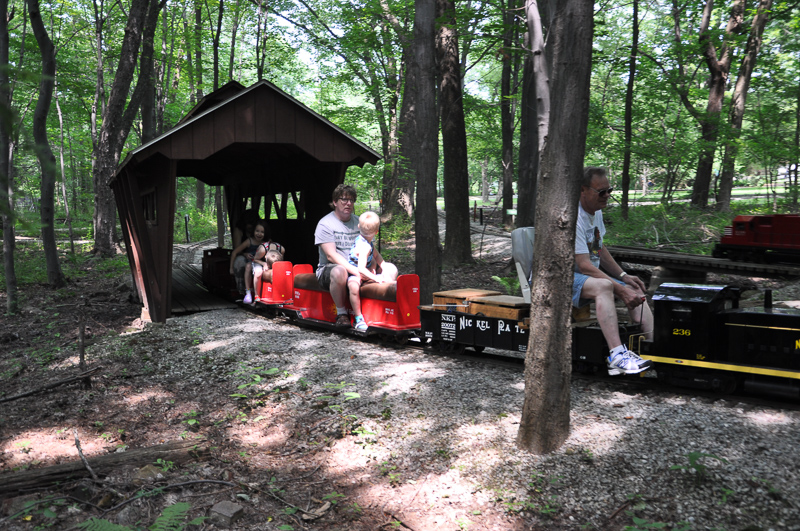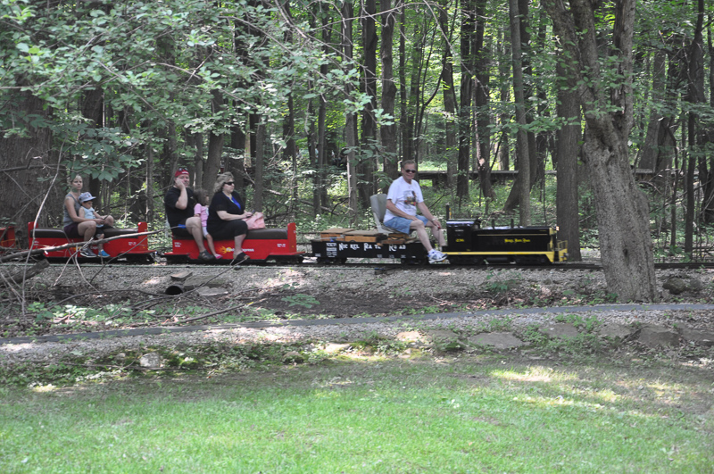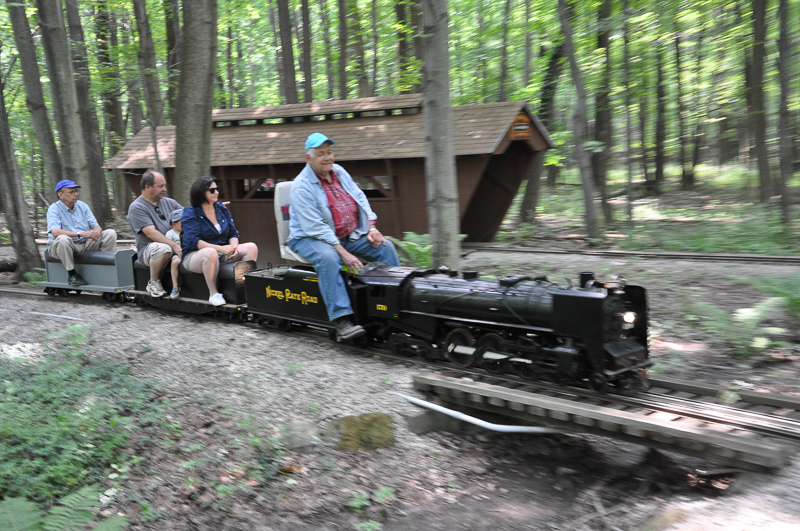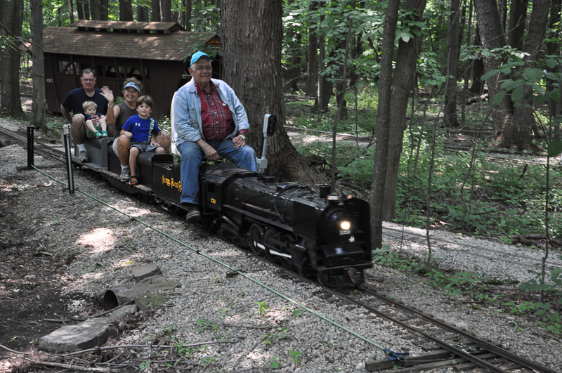 Paul Emch has just crossed over the Festival Bridge and shortly will be back at Shriver Station with his Nickel Plate Hudson steam engine. Next to come by at the same location is Ron Malinowski with his trainload of smiling riders. |
