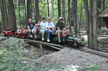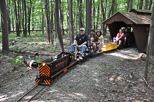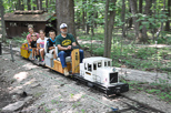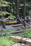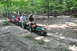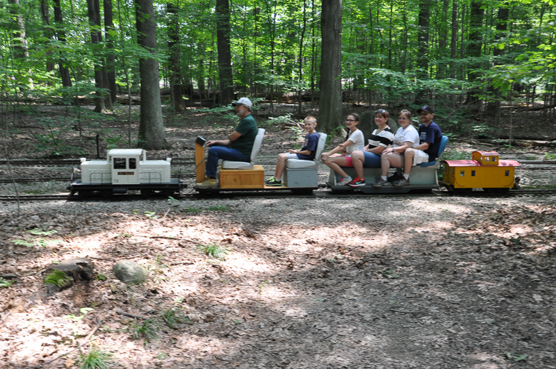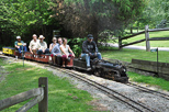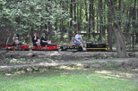 Standing on the Park Access Road, Paul Emch passes by with his next trainload of passengers as he starts to climb the grade to Mackey's Run. Ron was next to come along again with his smiling passengers as it's a beautiful day for a run today. |