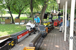 After taking the mandatory ride prior to the run to check out the engine and cars that everything is okay, East Wind sits in front of the station doing mosquito control. As it gets near to the 1 o'clock start time the trains are lined up at the station ready to take on their passengers. |