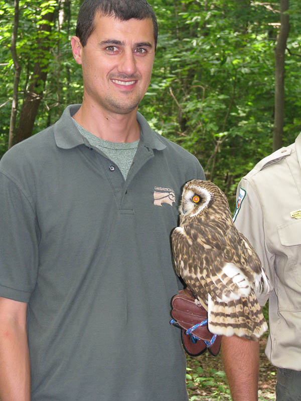 During the day I found Dan Burnett was taking a red tailed Hawk that is under the Park's care for a walk. Pat Morse was also along carrying an owl for the walk in the woods and I was able to get these pictures. |