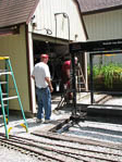 The transfer table lift comes in handy to raise Harry to the right height for working on the cable support. Judson Elliott works on lubricating and any adjustments needed on the yard switches behind Willis Car Barn. |